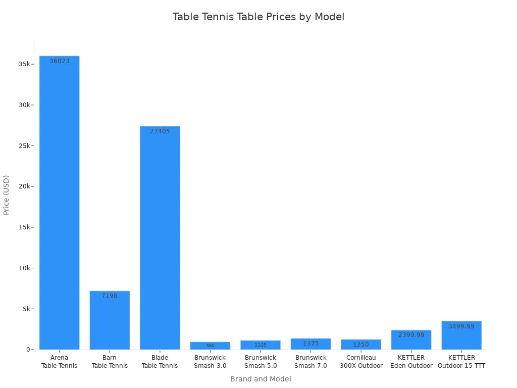 Цены на столы для настольного тенниса очень разные. Некоторые простые столы стоят менее 1000 долларов. Самые дорогие могут стоить более 30 000 долларов. Большинство домашних и клубных столов стоят от 900 до 2500 долларов. Цена зависит от материалов, толщины столешницы и бренда. Ниже представлена таблица цен на популярные бренды и модели: